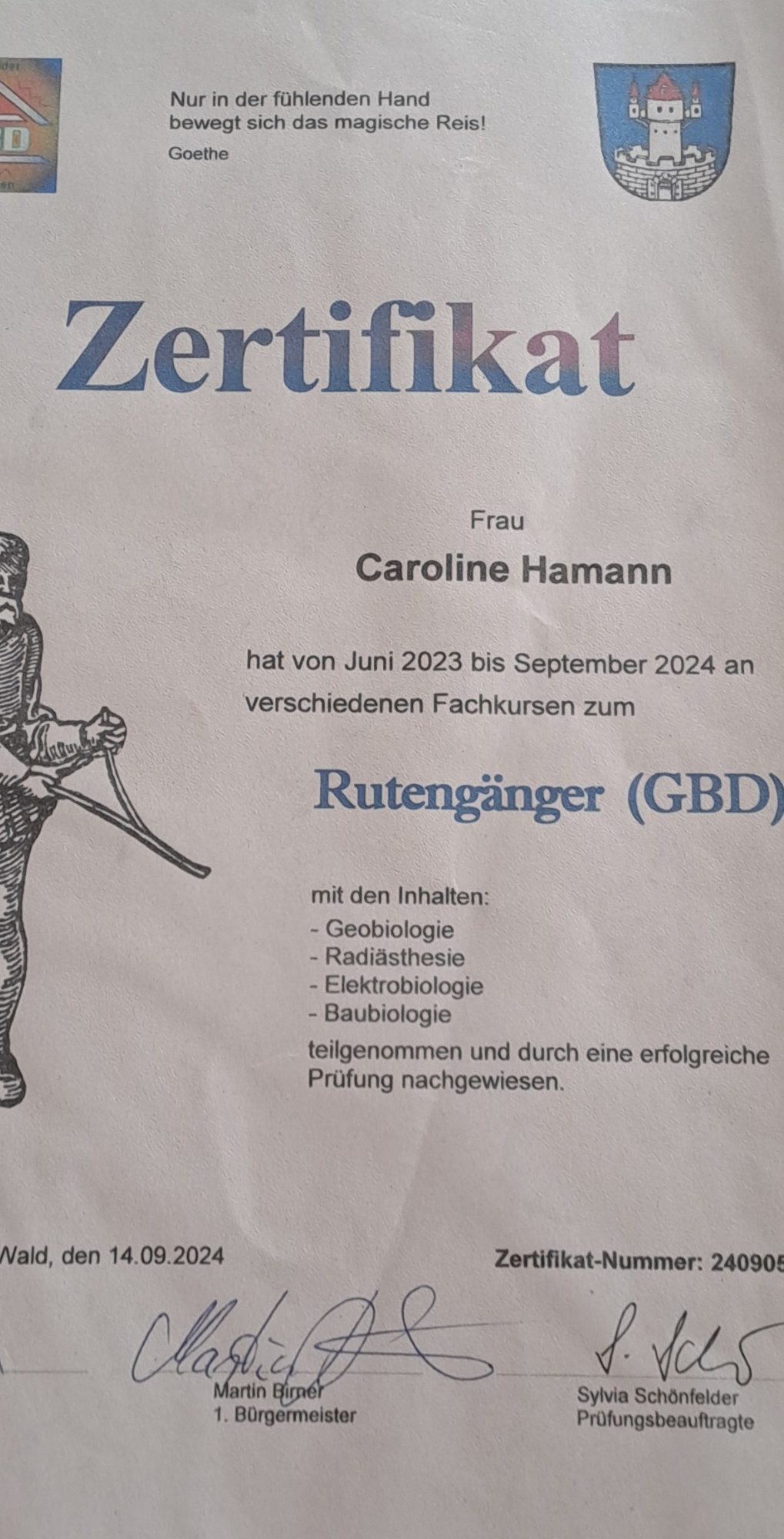 Ich bin ausgebildete Rutengängerin und untersuche Ihr Wohnhaus, oder auch vor Bebauung Ihren Bauplatz, auf Erdstrahlen, wie z.B. Wasseradern, das Benker-Gitternetz und Verwerfungen. Ich verwende hierzu zwei Winkelruten und einen Kompass. Weiter berate ich Sie zum Thema Elektrosmog. Ziel meiner Arbeit ist es, für jedes Familienmitglied einen optimalen Schlafplatz zu finden. Auch ein störungsfreier Arbeitsplatz ist wichtig. Ansonsten bin ich viel in der Natur unterwegs, der Wald ist mein Lieblingsort.